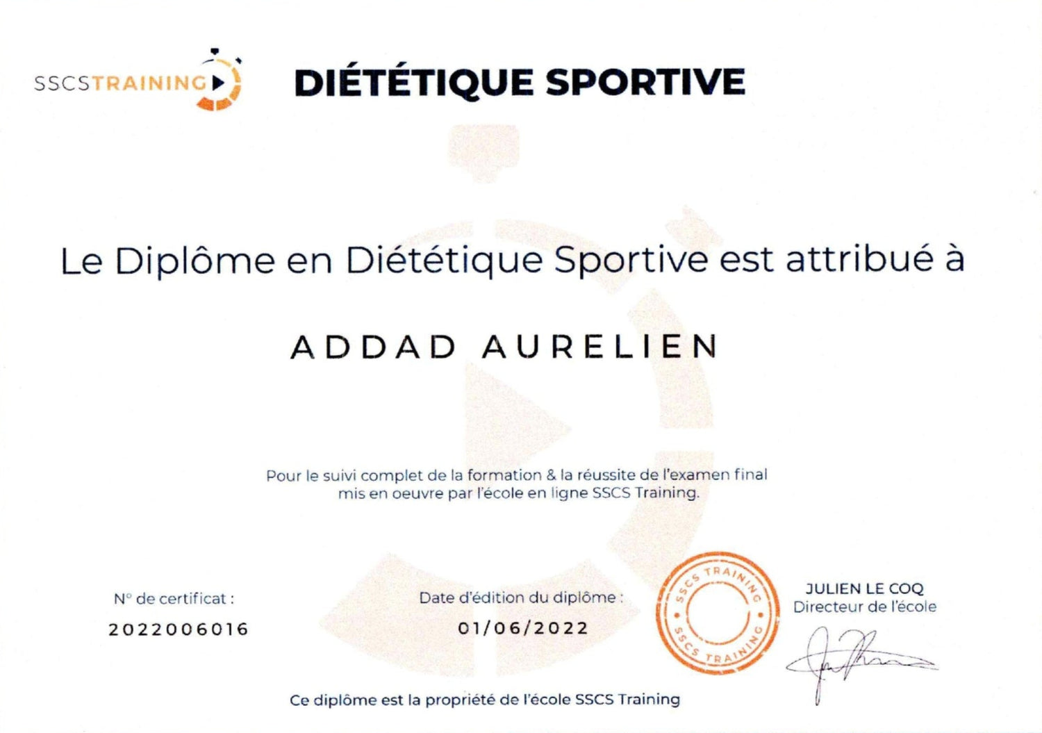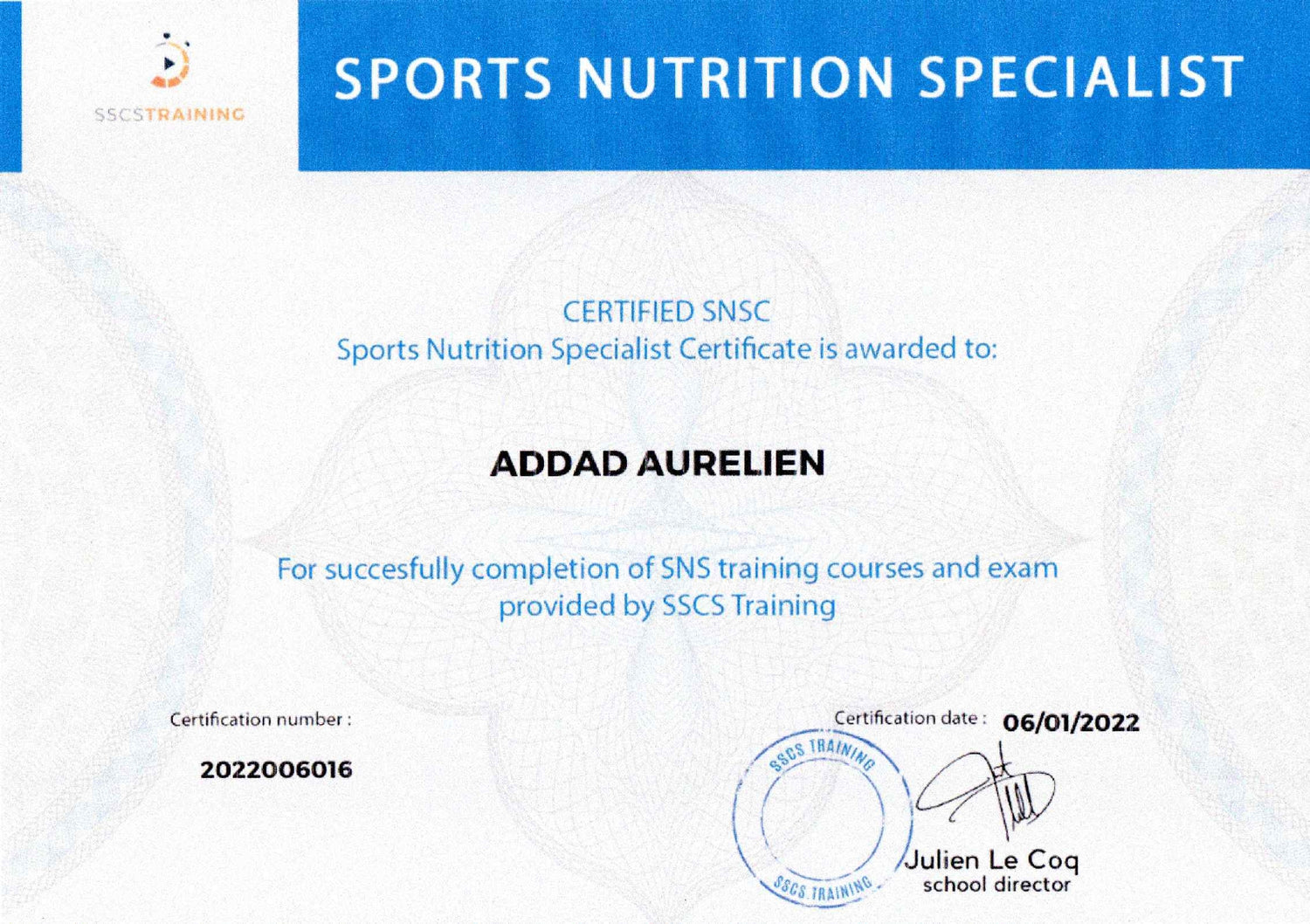 J'ai obtenu en 2022 le Sports Nutrition Specialist Certificate.